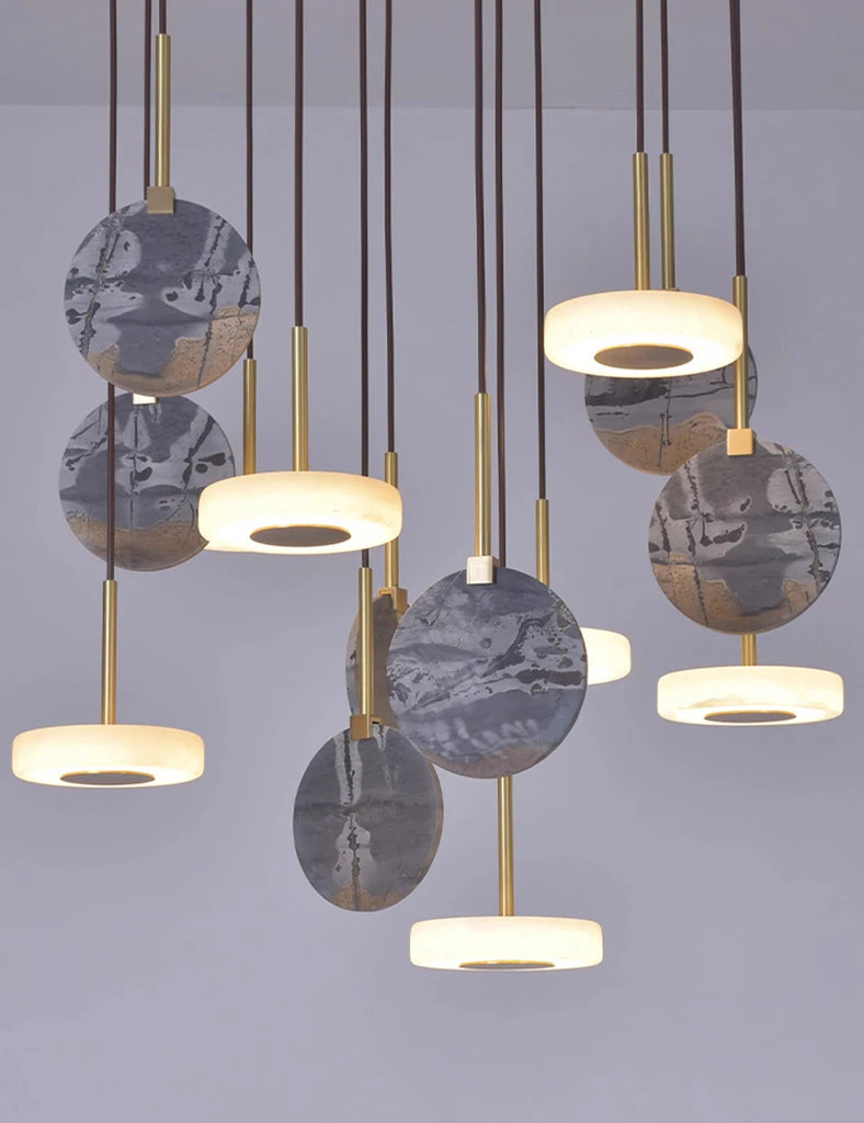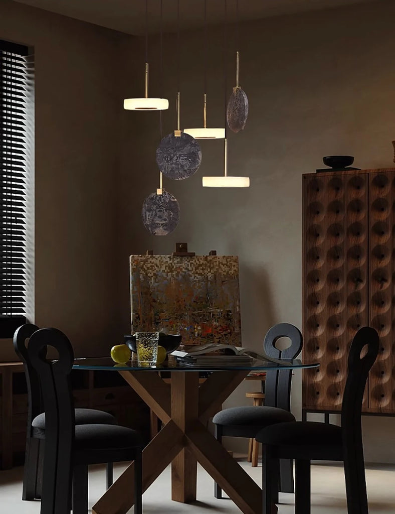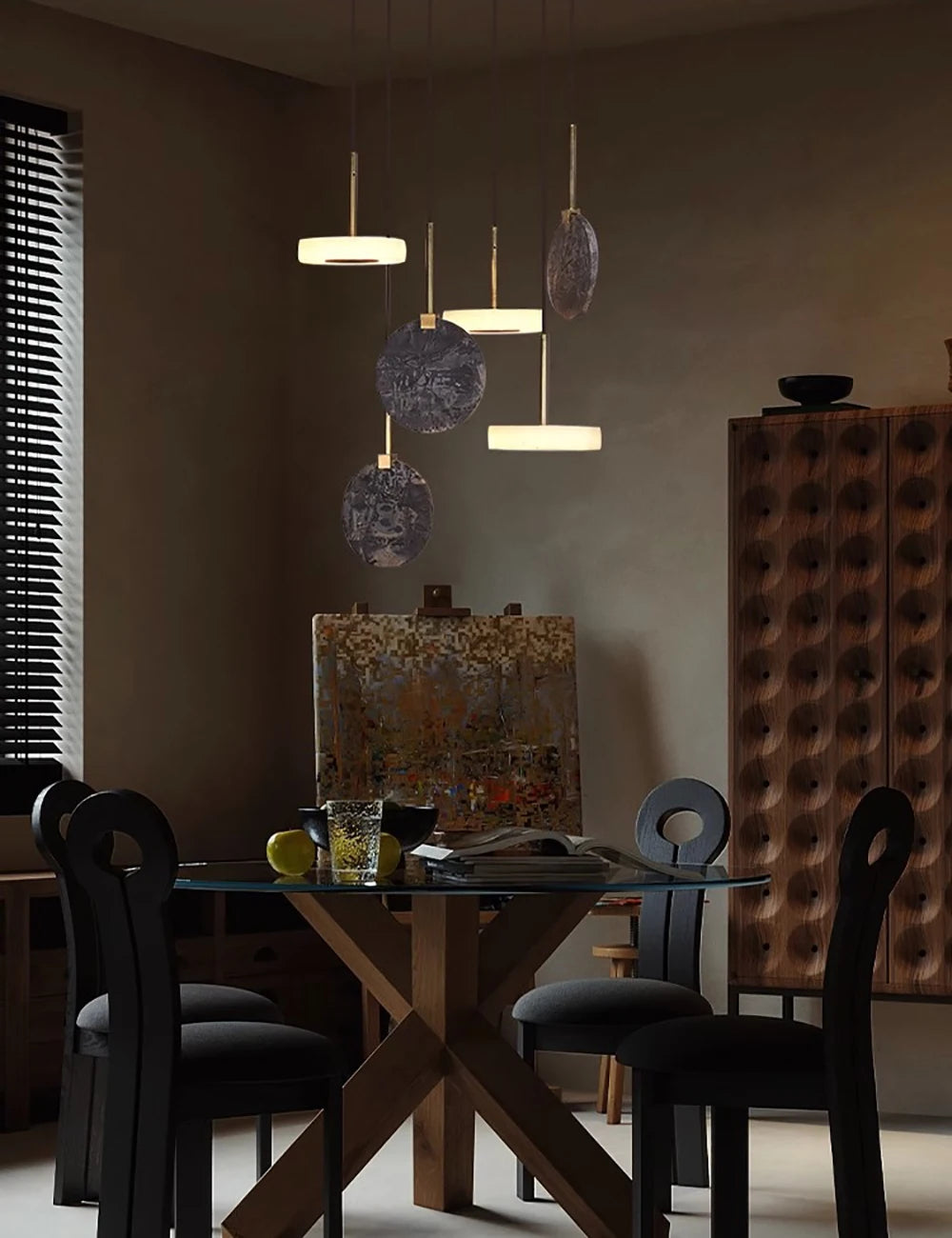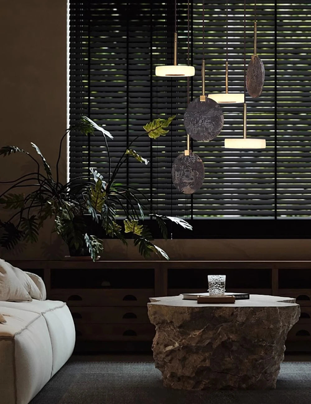 - The Akolia Luréa Marble & Wood Couple LED Chandelier embodies balance and intimacy through contrasting materials—cool marble and warm wood. Each handcrafted element hangs in a calm, rounded composition, casting a soft ambient glow ideal for cozy living rooms, bedrooms, and elegant dining interiors. Its timeless look blends organic texture with modern LED sophistication for natural-luxury décor.