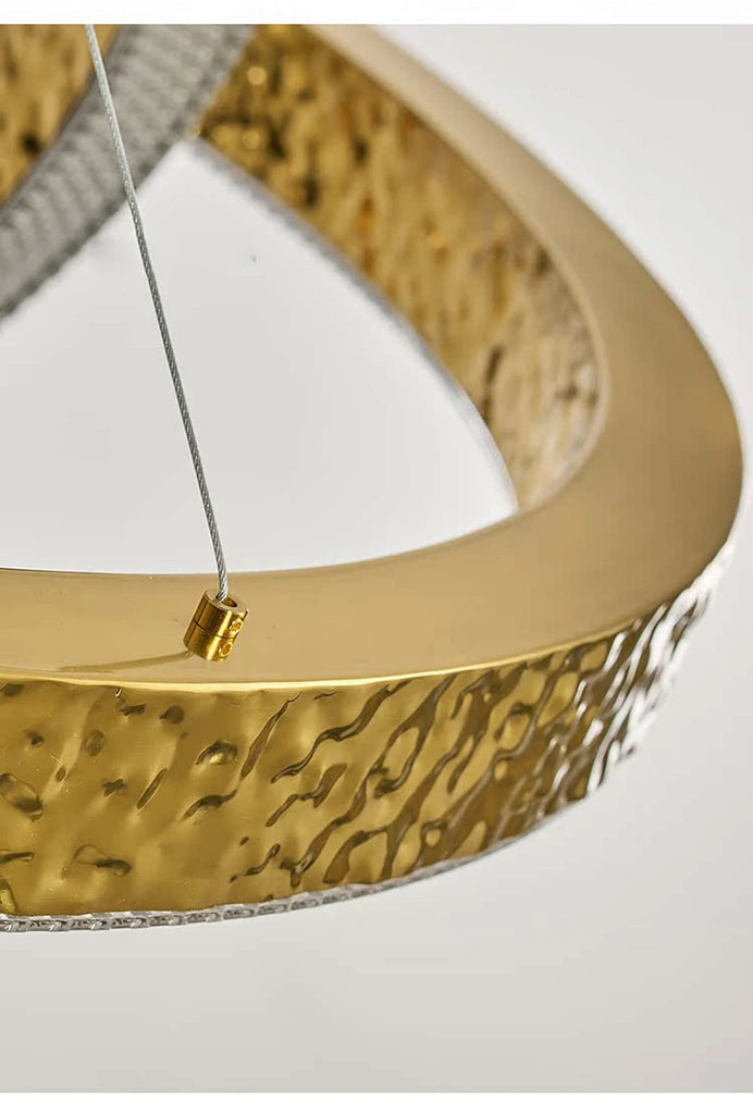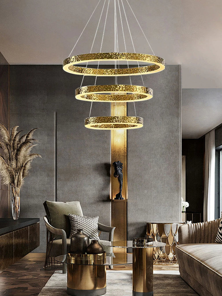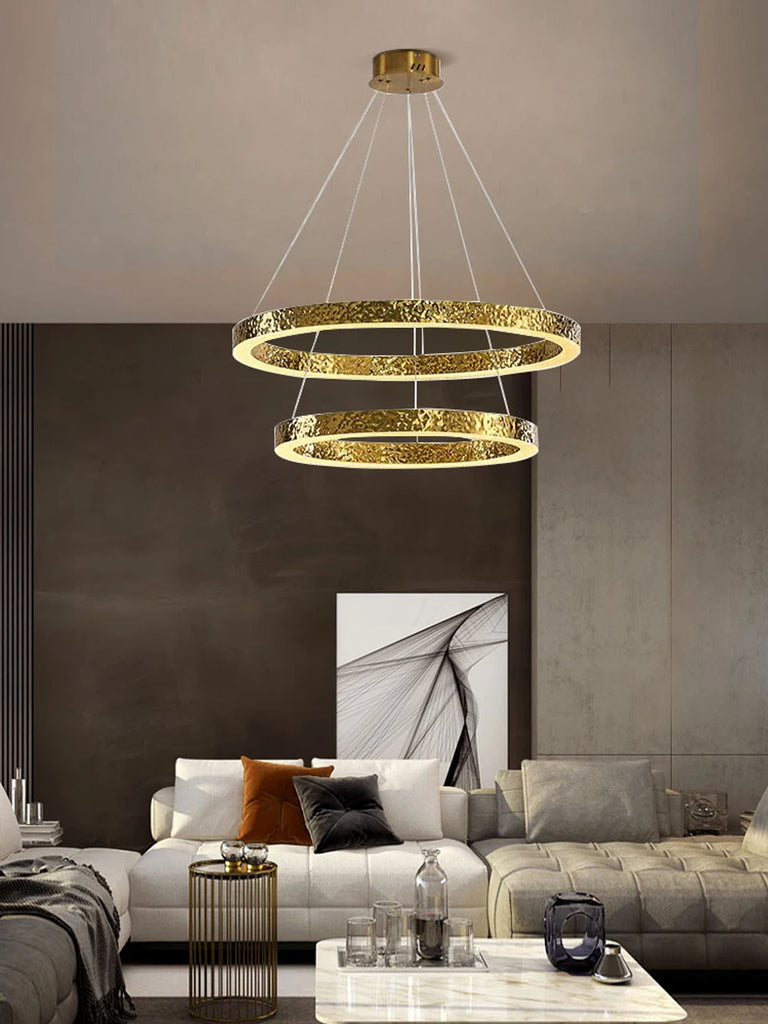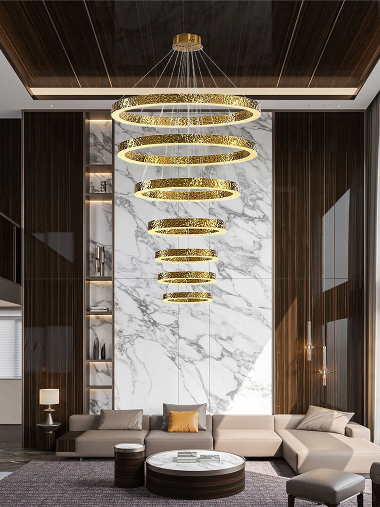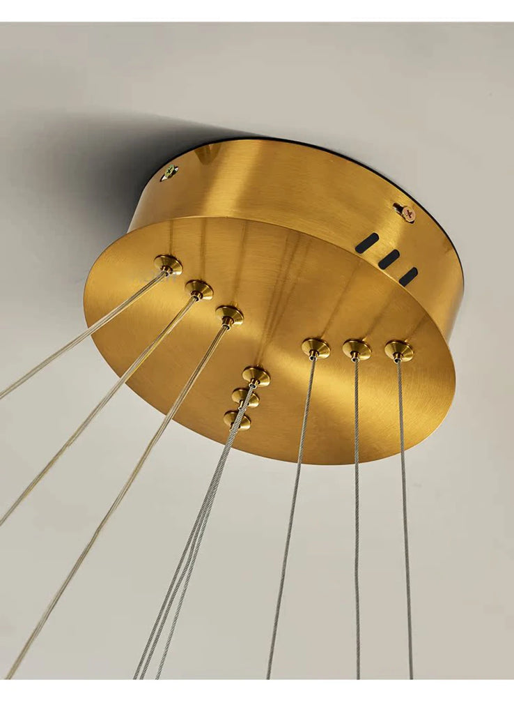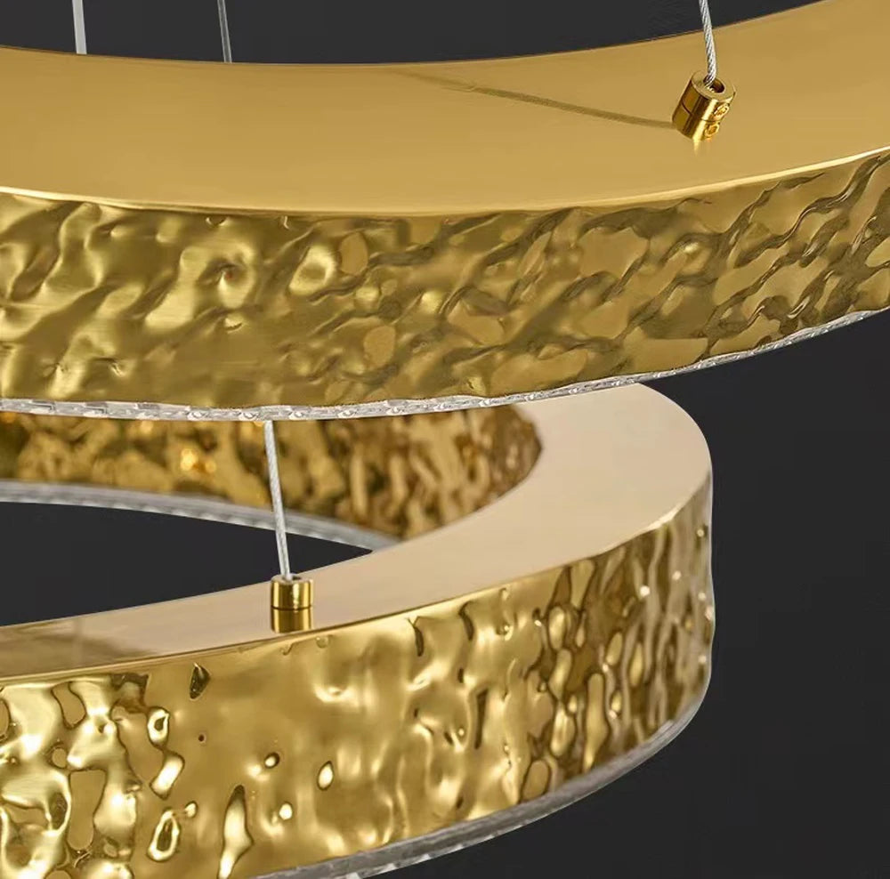 - The WJASON Aurevo Art Deco Copper Crystal Ring Chandelier embodies refined craftsmanship and sculptural elegance. Its hand-finished hammered copper rings encase shimmering crystals that radiate warm, luminous light, creating a captivating visual centerpiece from every angle. Suspended by adjustable cables, Aurevo enhances both modern and classic interiors—perfect for living rooms, dining areas, foyers, staircases, or double-height ceilings. The design balances luxury and artistry, transforming open spaces into glowing architectural statements.