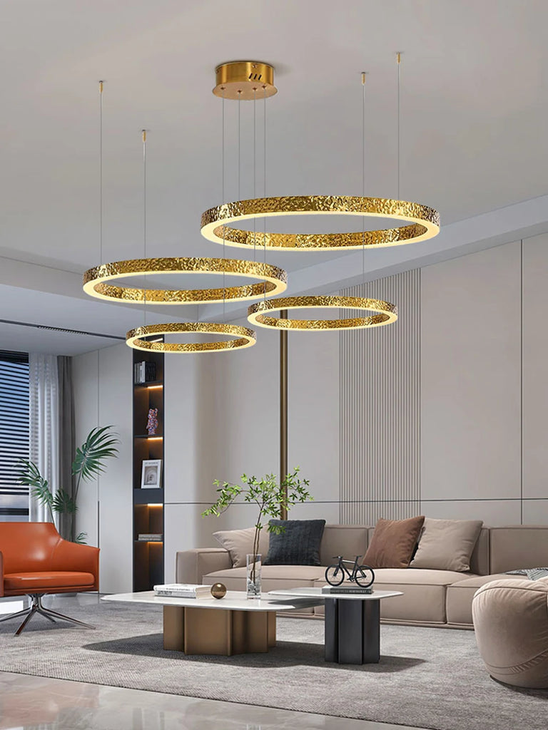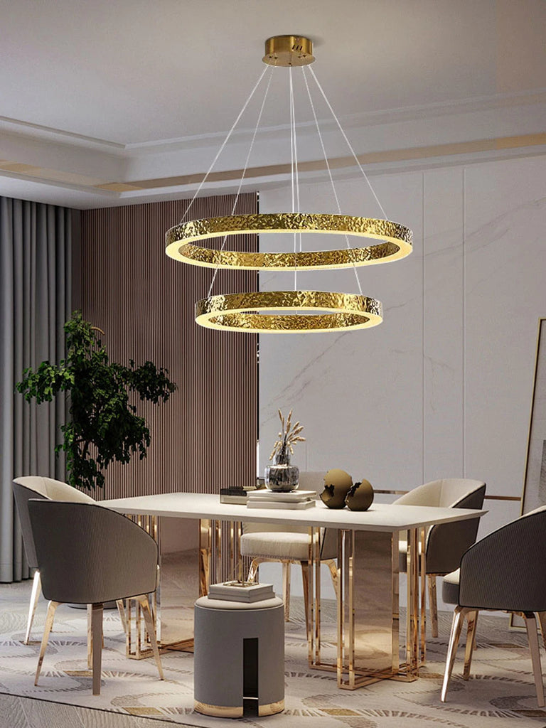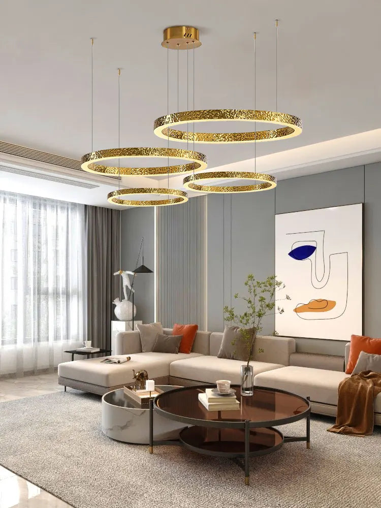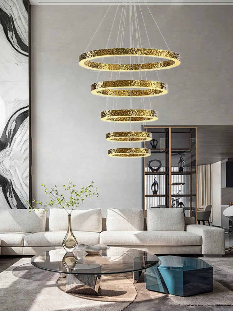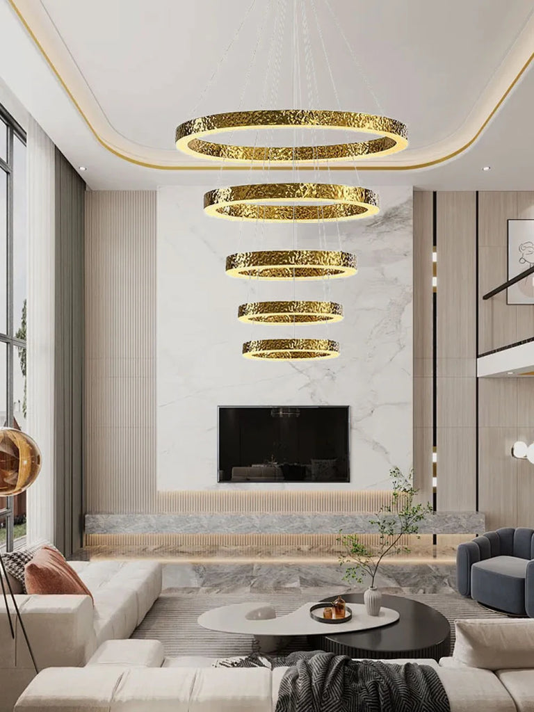 - The WJASON Aurevo Art Deco Copper Crystal Ring Chandelier embodies refined craftsmanship and sculptural elegance. Its hand-finished hammered copper rings encase shimmering crystals that radiate warm, luminous light, creating a captivating visual centerpiece from every angle. Suspended by adjustable cables, Aurevo enhances both modern and classic interiors—perfect for living rooms, dining areas, foyers, staircases, or double-height ceilings. The design balances luxury and artistry, transforming open spaces into glowing architectural statements.