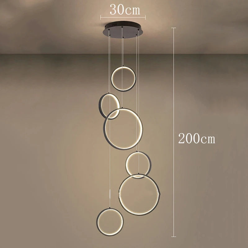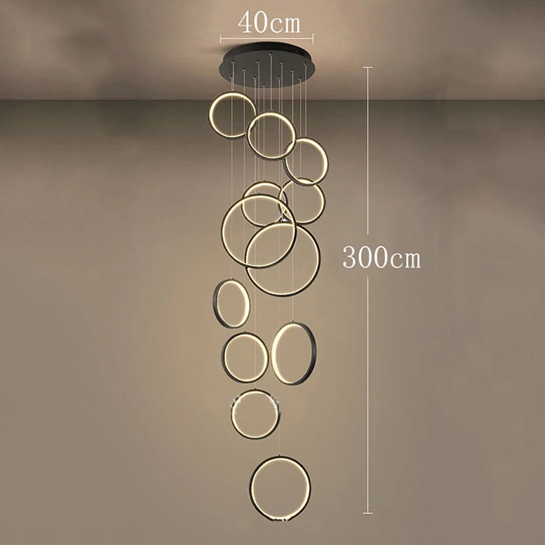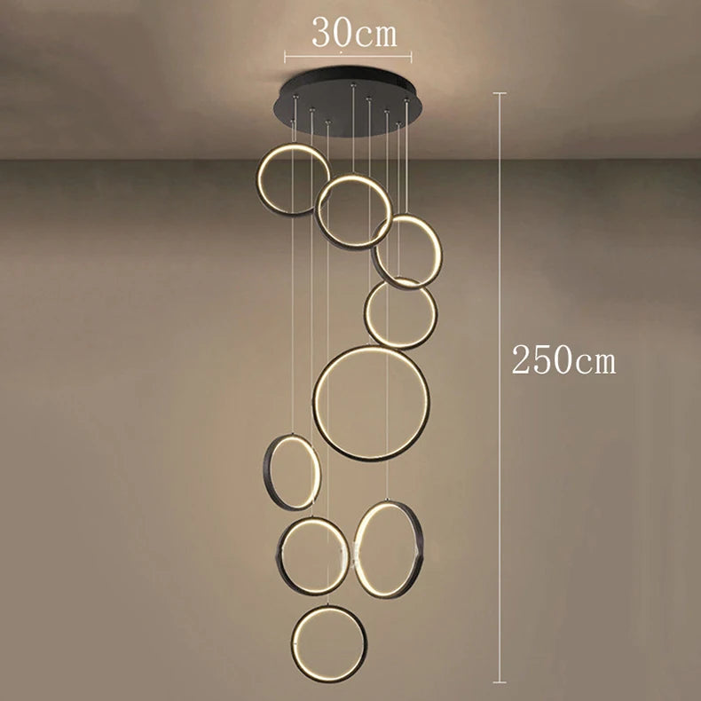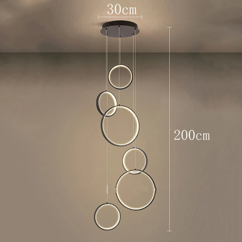 • The WL Cirvalo Modern LED Ring Cascade Chandelier combines sculptural elegance with minimalist design. Its circular rings descend gracefully at different heights, casting a soft, even glow that enhances modern interiors. Crafted from premium aluminum with integrated LED light, Cirvalo is ideal for dining rooms, staircases, foyers, and living rooms—bringing architectural balance, sophistication, and visual depth to any high-ceilinged space.