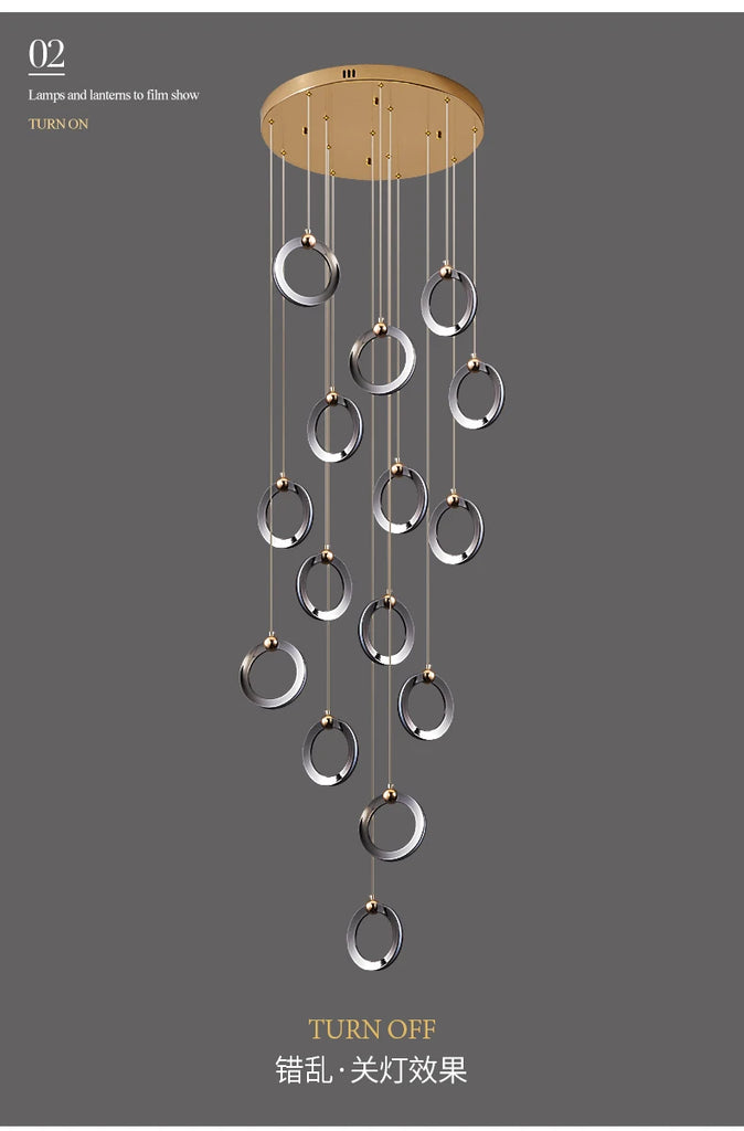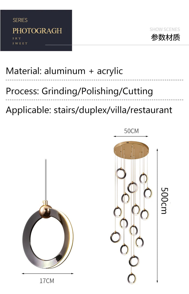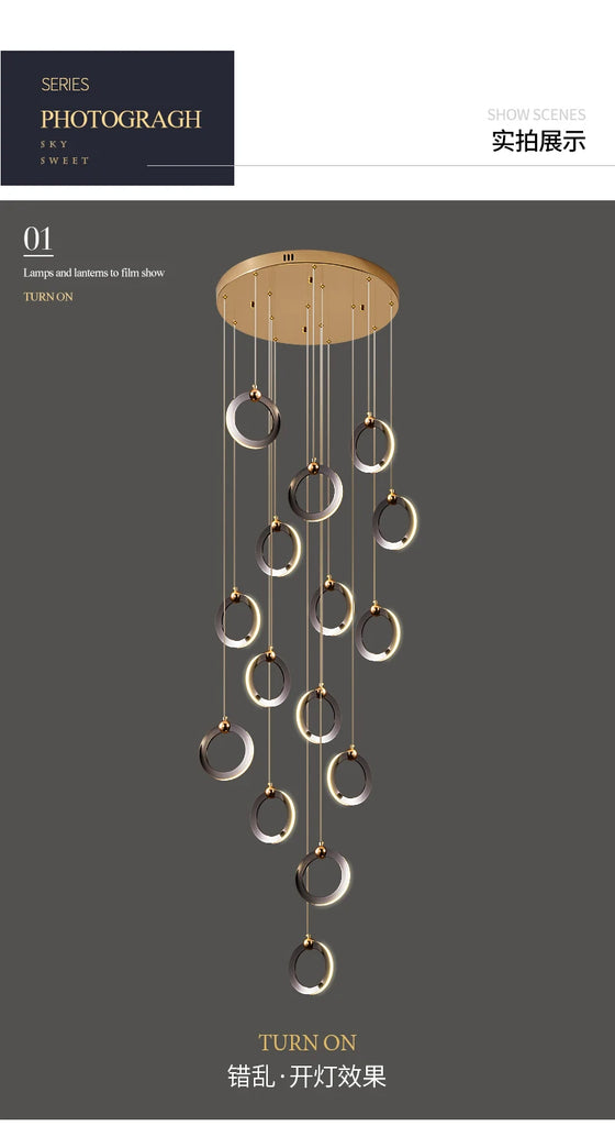 • ✔ Minimalist cascading ring chandelier in elegant black and gold