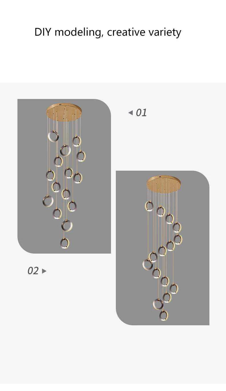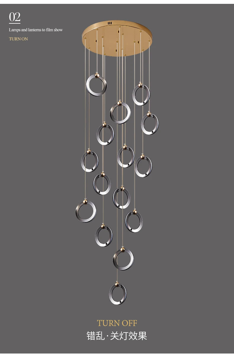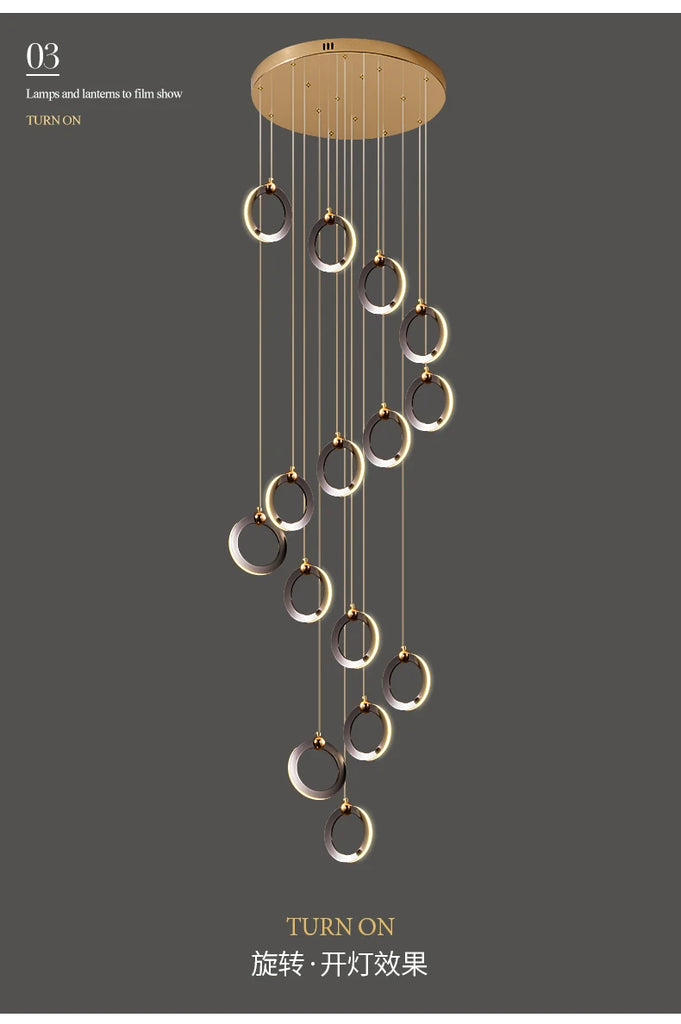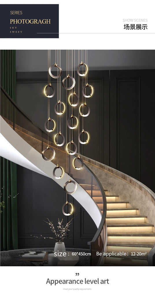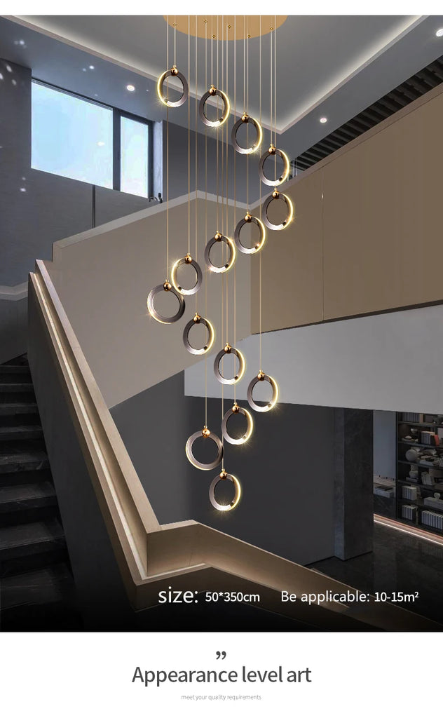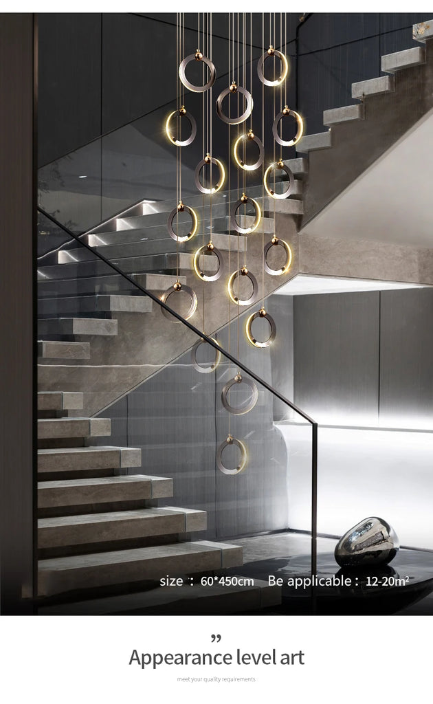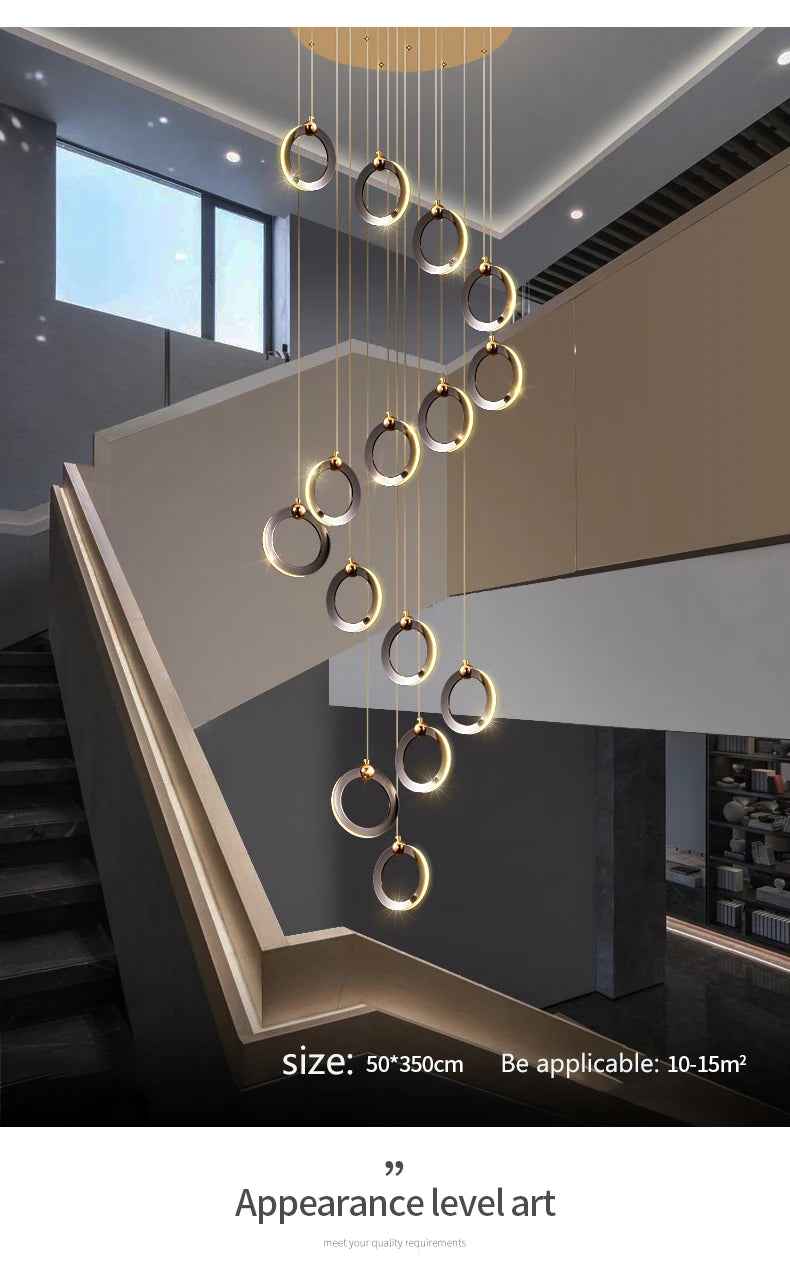 • The WL Rynel Black Gold Minimalist Ring Staircase Chandelier embodies light luxury and architectural grace. Featuring floating circular pendants finished in matte black and pearl gold, it creates a refined contrast of modern minimalism and sculptural artistry. Perfectly suited for duplex staircases, villas, lofts, and high-ceiling living rooms, Rynel’s cascading layout and warm LED illumination bring depth and elegance to contemporary interiors.