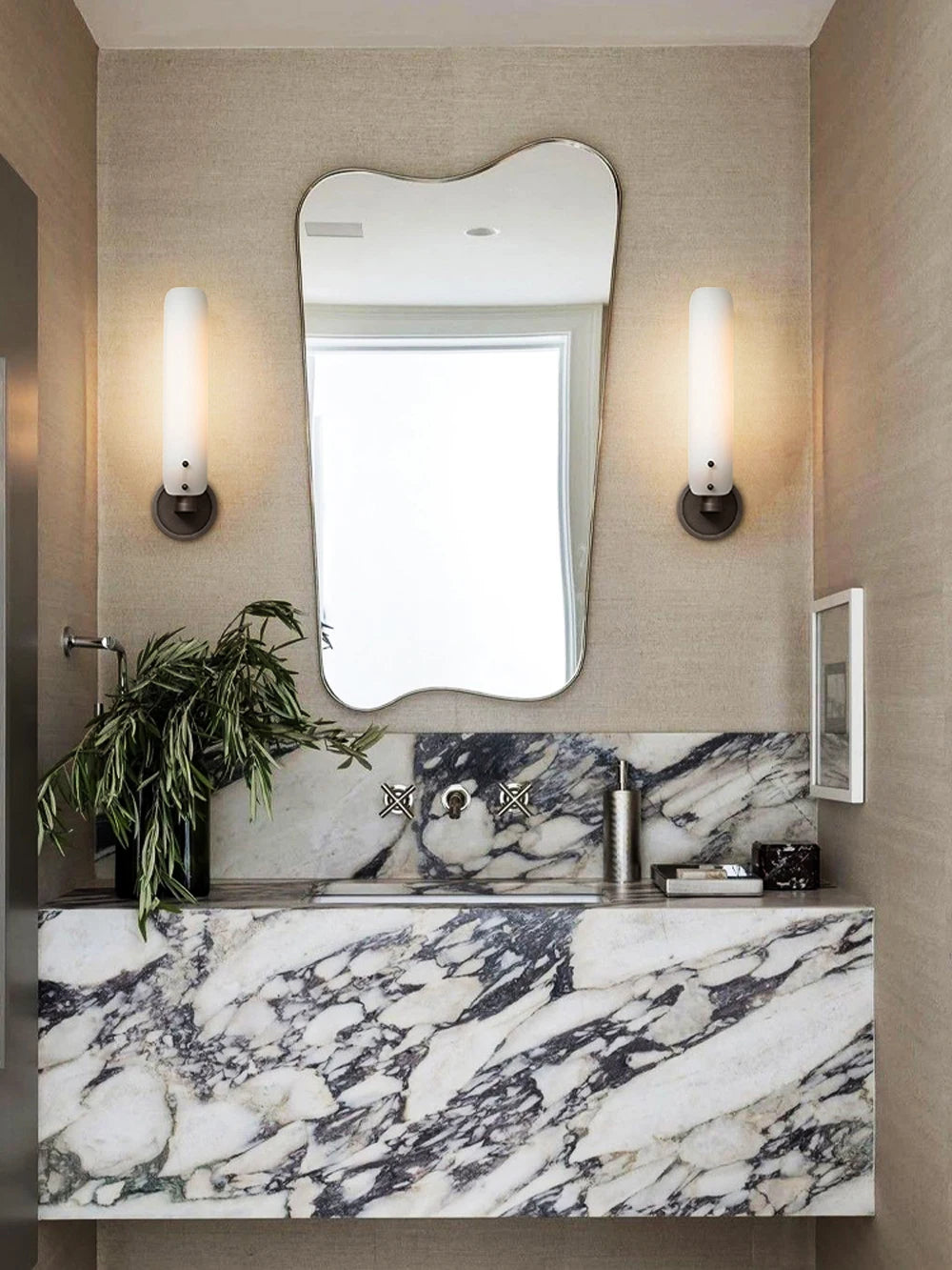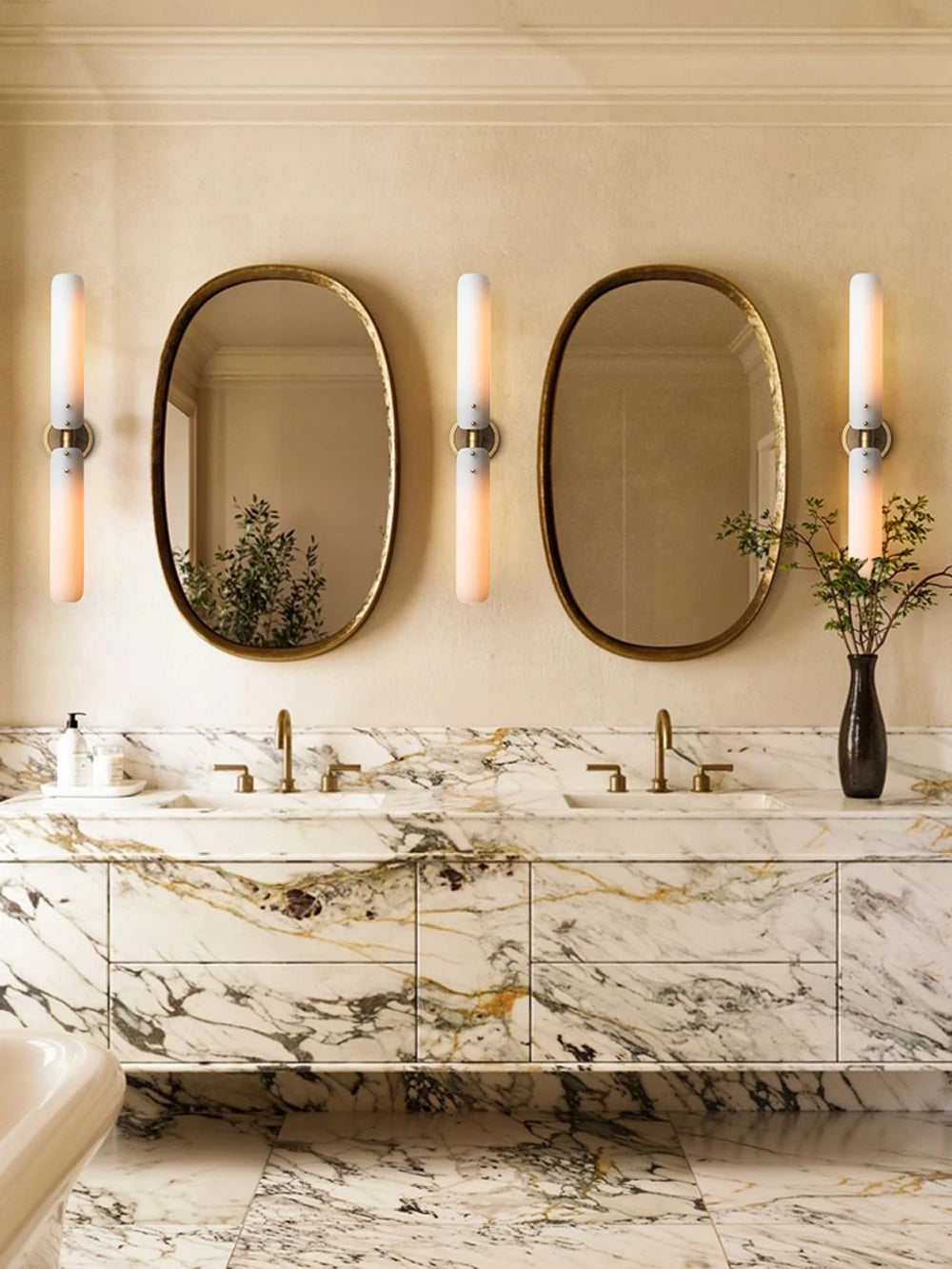 Brass, Chrome, Black Hardware; White Glass