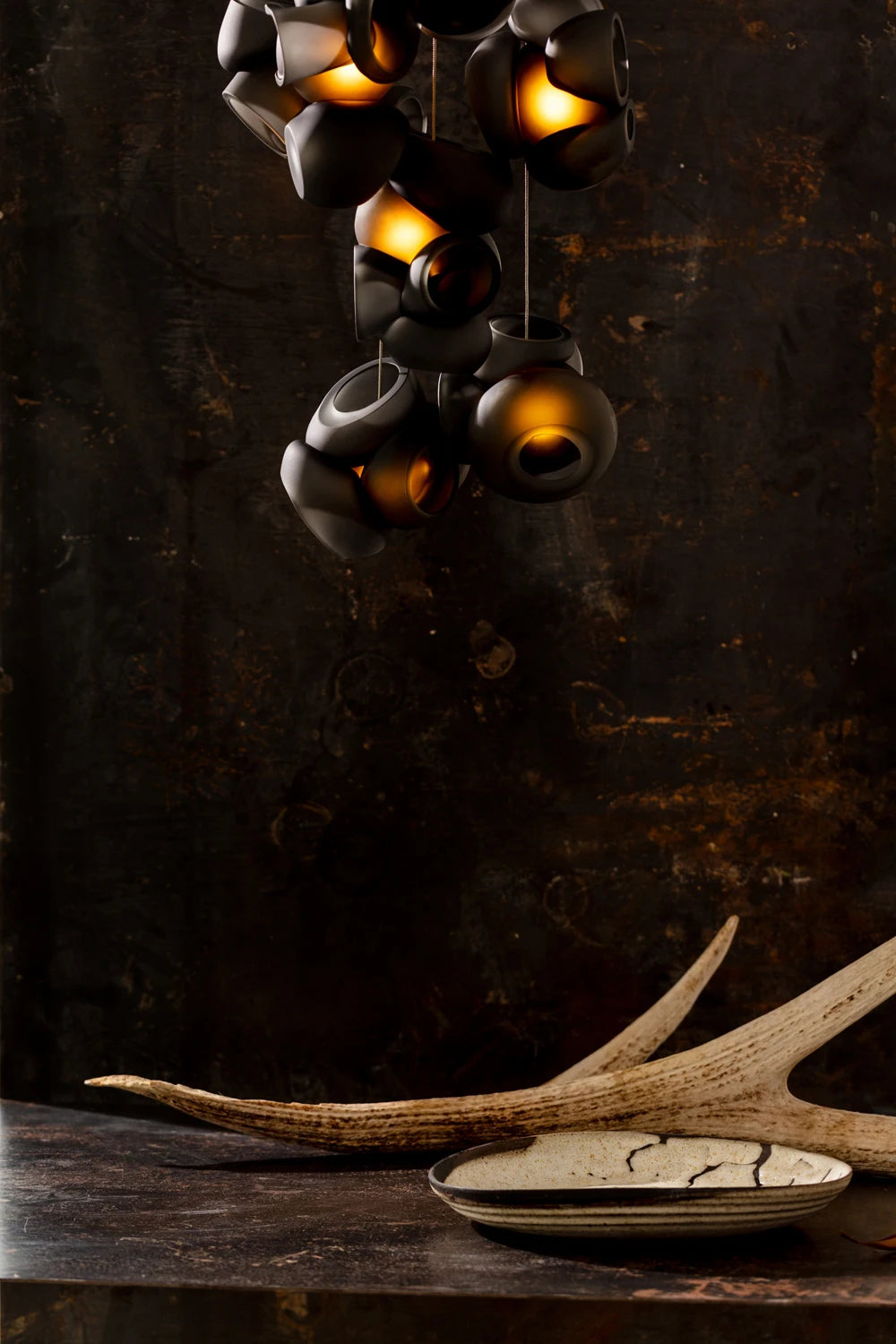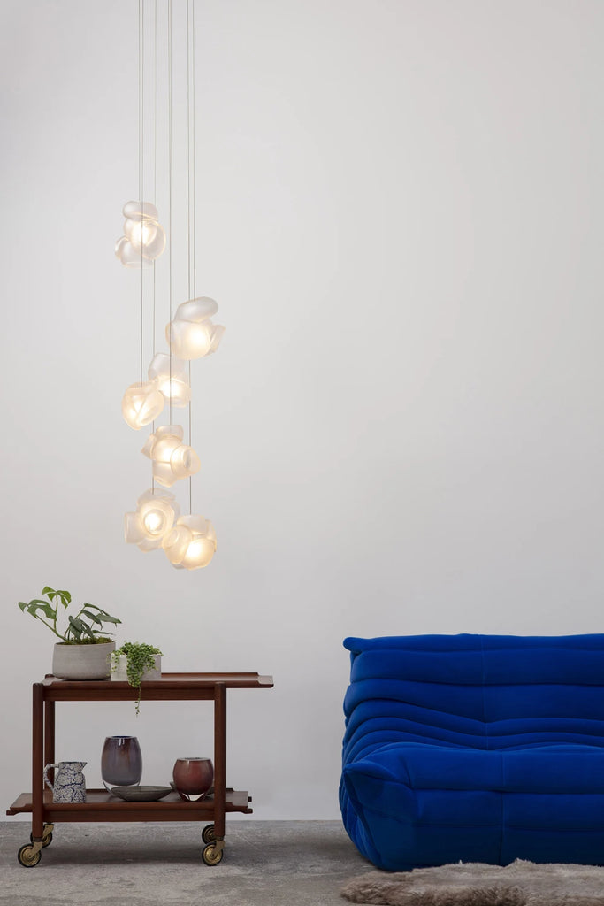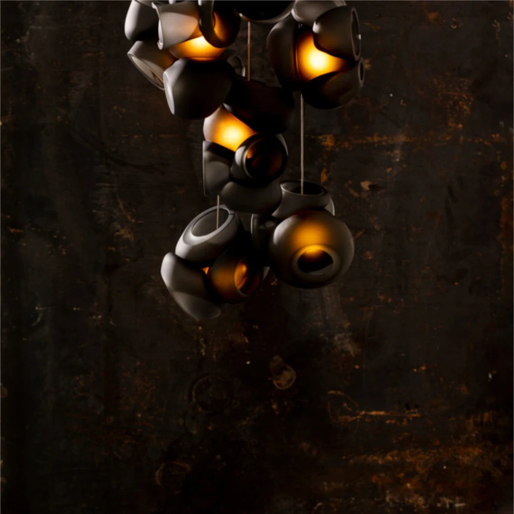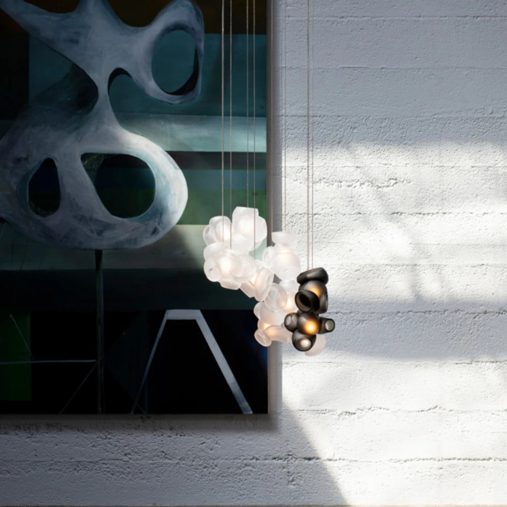 - The Koli Ebréa Pendant Light transforms ordinary lighting into art. Each glass form is hand-blown, resembling floating organic clusters that diffuse a warm, poetic glow. Available in multiple finishes — smoky, amber, white, or rose — Ebréa adds character to modern interiors, from dining spaces to galleries or staircases.