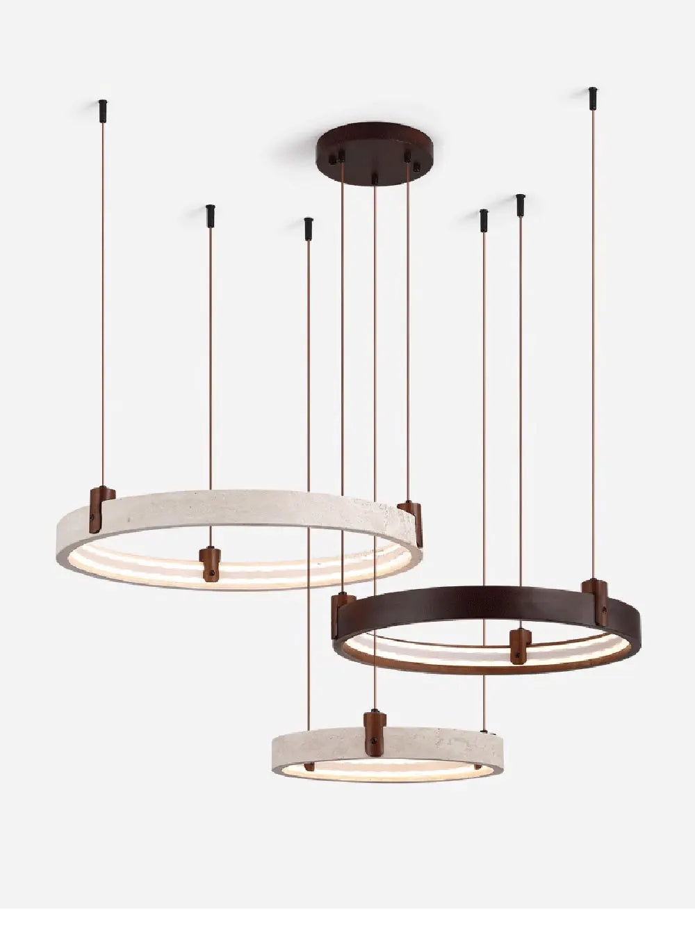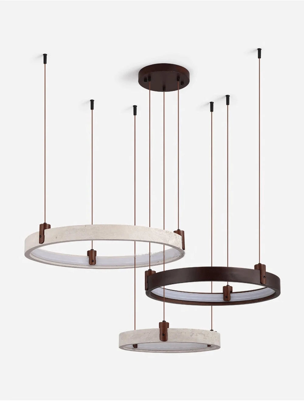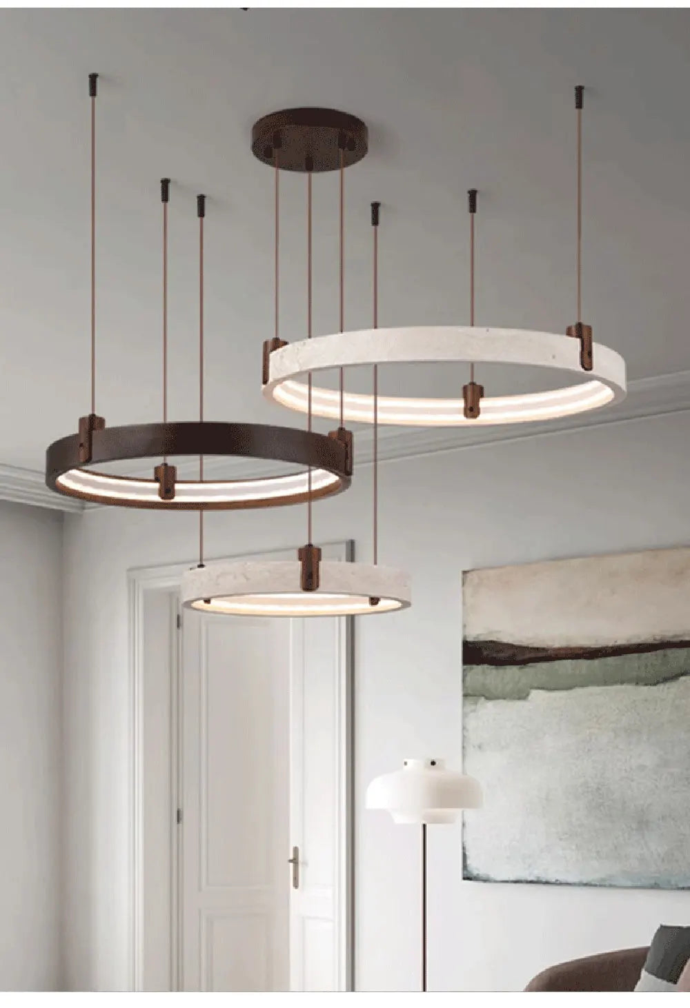 - This contemporary stone ring chandelier blends natural materials with modern lighting design to create a striking centerpiece for living rooms, foyers, and dining spaces. The unique circular structure combines stone, wood, and iron elements, producing a refined balance between natural texture and modern craftsmanship. Integrated LED lighting provides powerful illumination while maintaining energy efficiency. The chandelier offers multiple light color options including warm light, neutral light, white light, and dimmable settings controlled by a remote, allowing you to easily adjust the ambiance of your space. Its sculptural ring design makes it ideal for modern interiors, luxury homes, and architectural spaces seeking a statement lighting fixture. Designed with durable materials and polished steel finishing details, this chandelier delivers both decorative beauty and long-lasting performance.