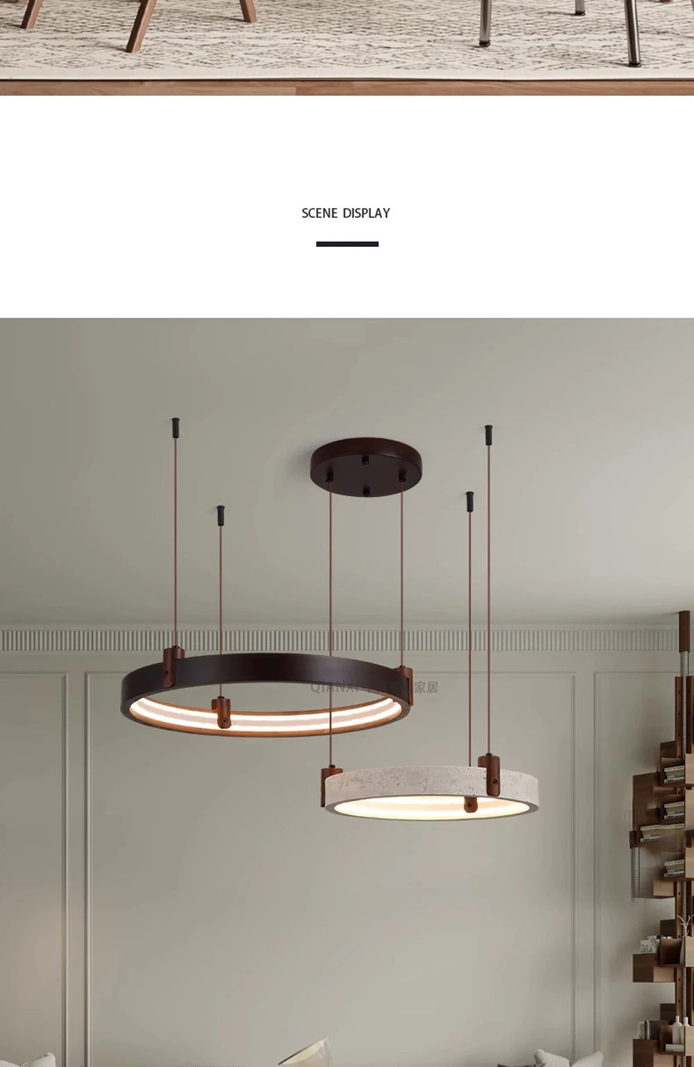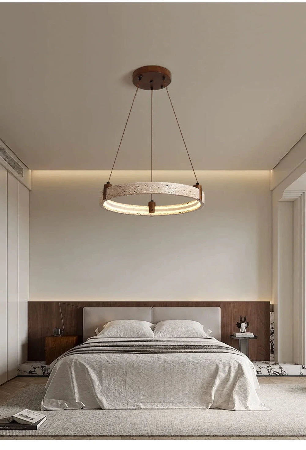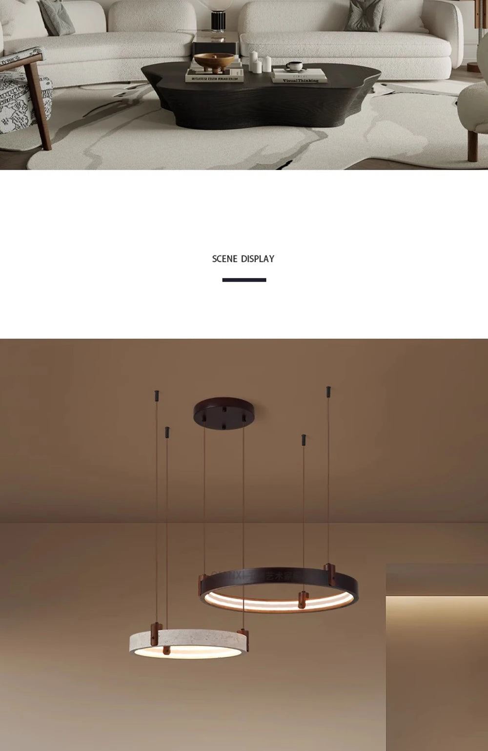 - This contemporary stone ring chandelier blends natural materials with modern lighting design to create a striking centerpiece for living rooms, foyers, and dining spaces. The unique circular structure combines stone, wood, and iron elements, producing a refined balance between natural texture and modern craftsmanship. Integrated LED lighting provides powerful illumination while maintaining energy efficiency. The chandelier offers multiple light color options including warm light, neutral light, white light, and dimmable settings controlled by a remote, allowing you to easily adjust the ambiance of your space. Its sculptural ring design makes it ideal for modern interiors, luxury homes, and architectural spaces seeking a statement lighting fixture. Designed with durable materials and polished steel finishing details, this chandelier delivers both decorative beauty and long-lasting performance.